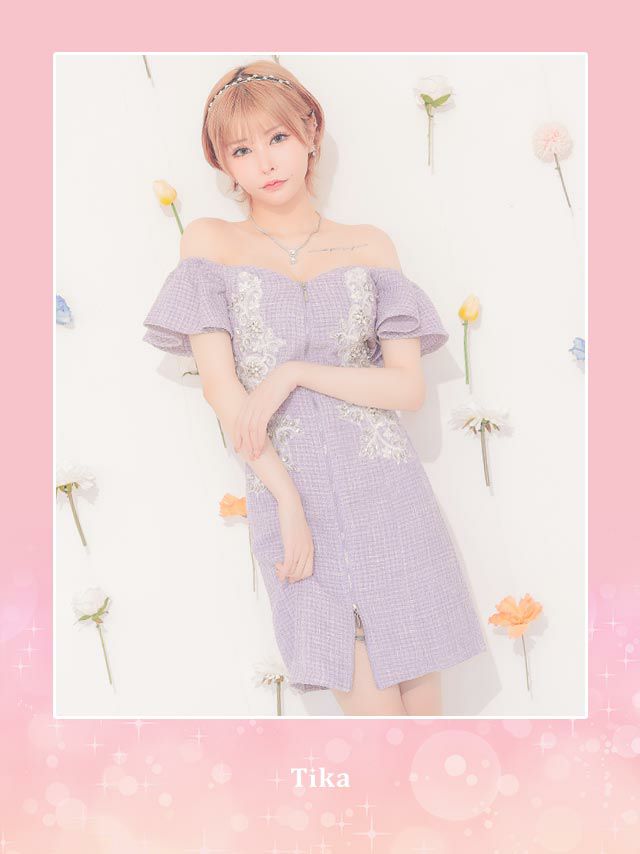 オフショルダーフリルフラワーモチーフ刺繍ビジューフロントジップツイードくびれタイトミニドレスのカラーバリエーション