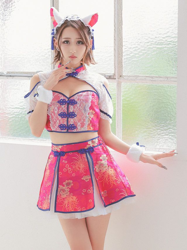 SALE [コスプレ] バストカットチャイナへそ出しシフォンフレアスカート個性ガーリーツイン猫アニマル [7点セット] (ジャケット/トップス/スカート/ヘッドドレス/透明ストラップ/カフス/尻尾)