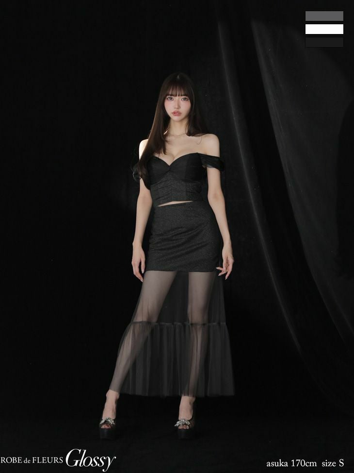 他の画像を見る 透ける足元に視線釘付け♡ [ROBEdeFLEURSGlossy/ローブドフルールグロッシー] 高級 ブランド Aラインロングドレス 谷間 オフショルダー セットアップ チュール切替 ラメニット ¥ 29,480 税込 お気に入りに追加