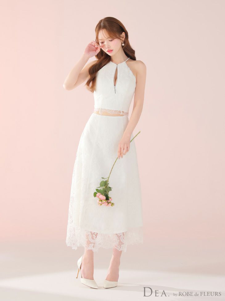 他の画像を見る 清楚な可愛さを纏う♡ 予約商品【4月下旬入荷予定】[DEA.byROBEdeFLEURS/ディアバイローブドフルール] 高級 ホルターネック ケミカルレース ジップ セットアップ Aラインロングドレス ¥ 34,980 税込 お気に入りに追加