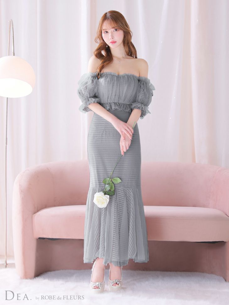 ふんわりと軽やかな印象に☆ [DEA.byROBEdeFLEURS/ディアバイローブドフルール] 高級オフショルダーチェック柄マーメイドフリルセットアップタイトロングタイトドレス