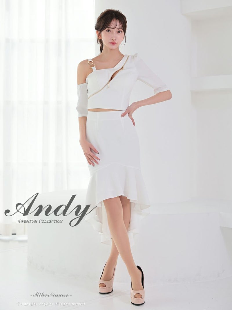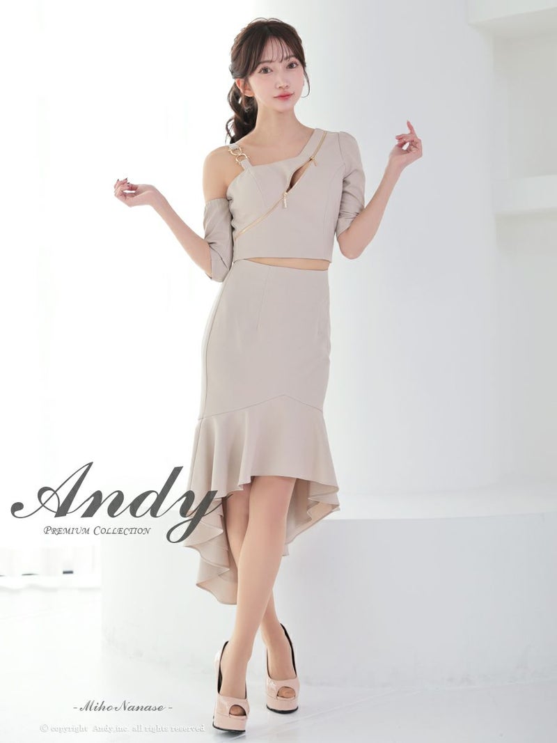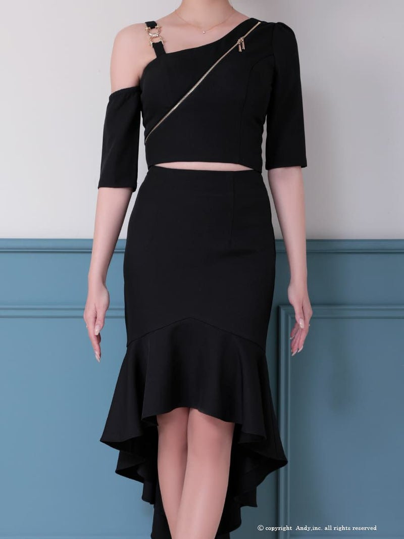キャバドレス Andy アンディ ワンショルダー ロングテール ジップデザイン ワンカラー マーメイド セットアップ タイトミディ キャバドレス