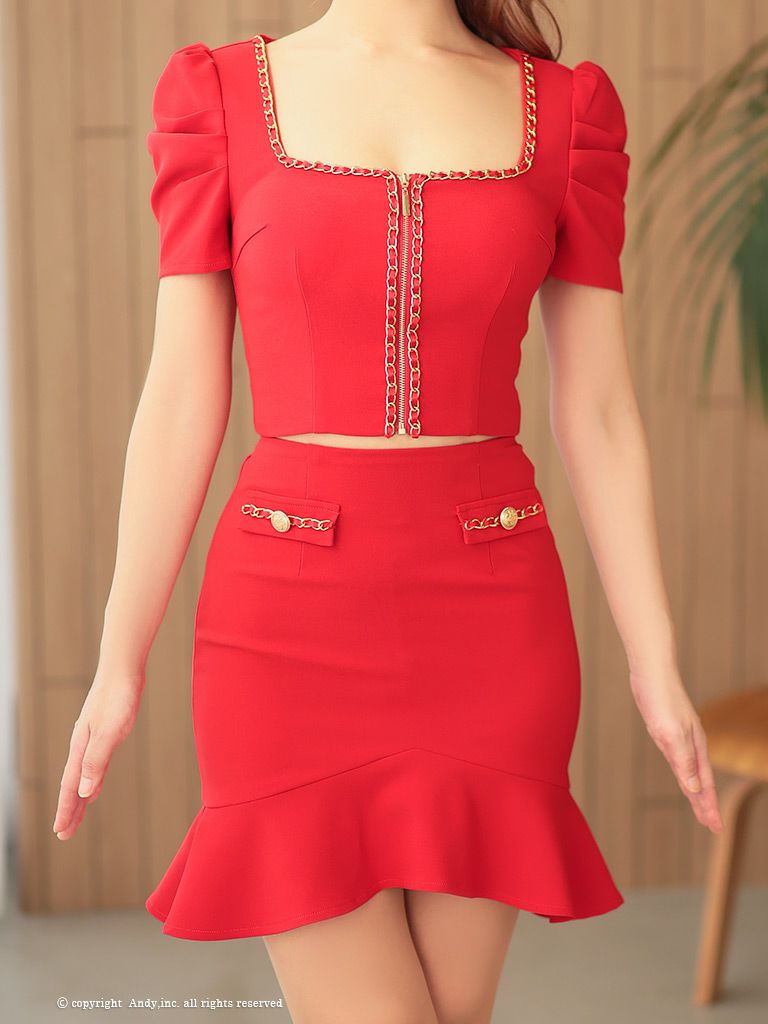 5. [Andy/アンディ] 高級半袖 スクエアネック セットアップ ジップ チェーン 裾フリル タイトミニドレス