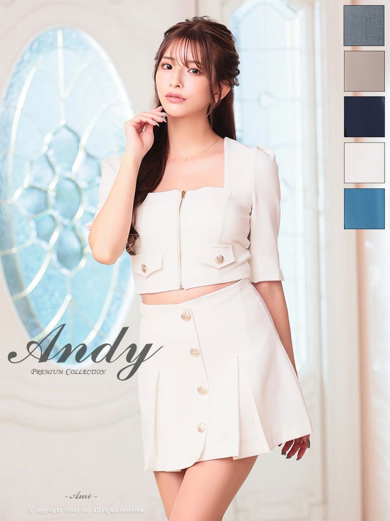 キャバドレス Andy アンディ 高級 ワンカラー ジップデザイン ボタン セットアップ 七分袖 フレアミニドレス