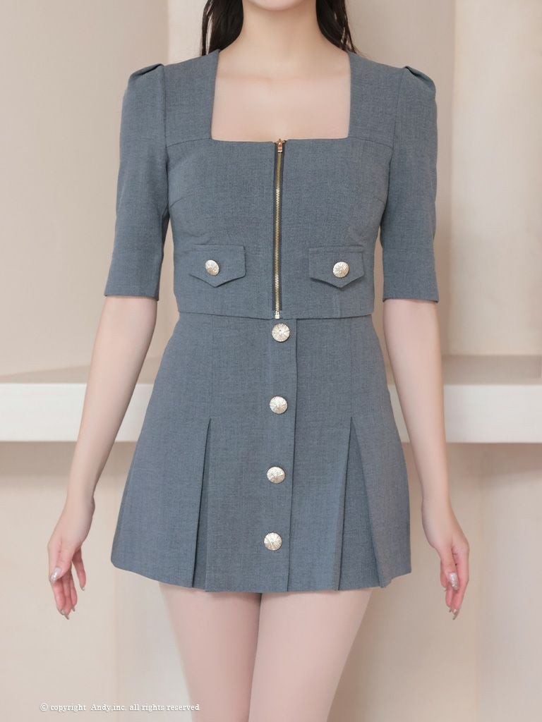 ワンカラーにジップが映えるクールなデザイン★ [Andy/アンディ] 高級 ジップデザイン ボタン セットアップ 袖あり フレアミニドレス