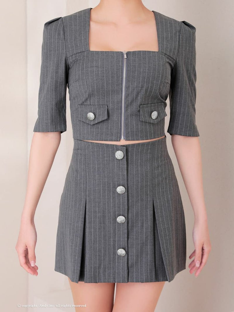 6. [Andy/アンディ] 高級 袖あり 五分袖 ストライプ スクエアネック ジップ セットアップ プリーツ フレア ミニドレス