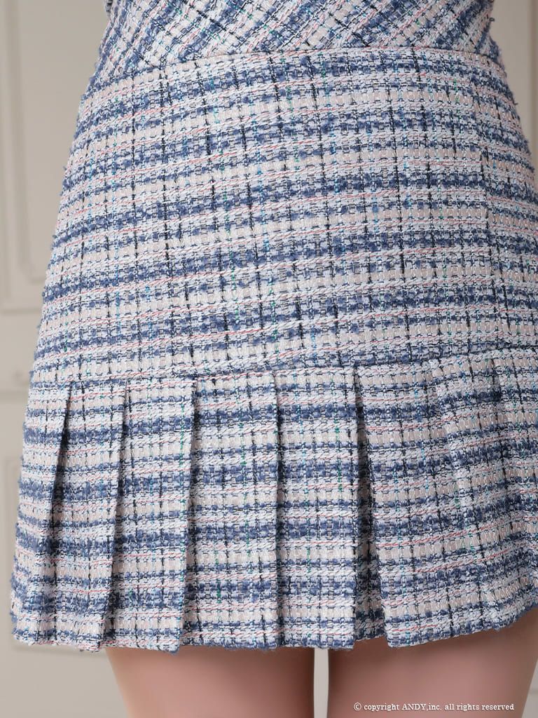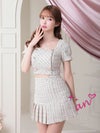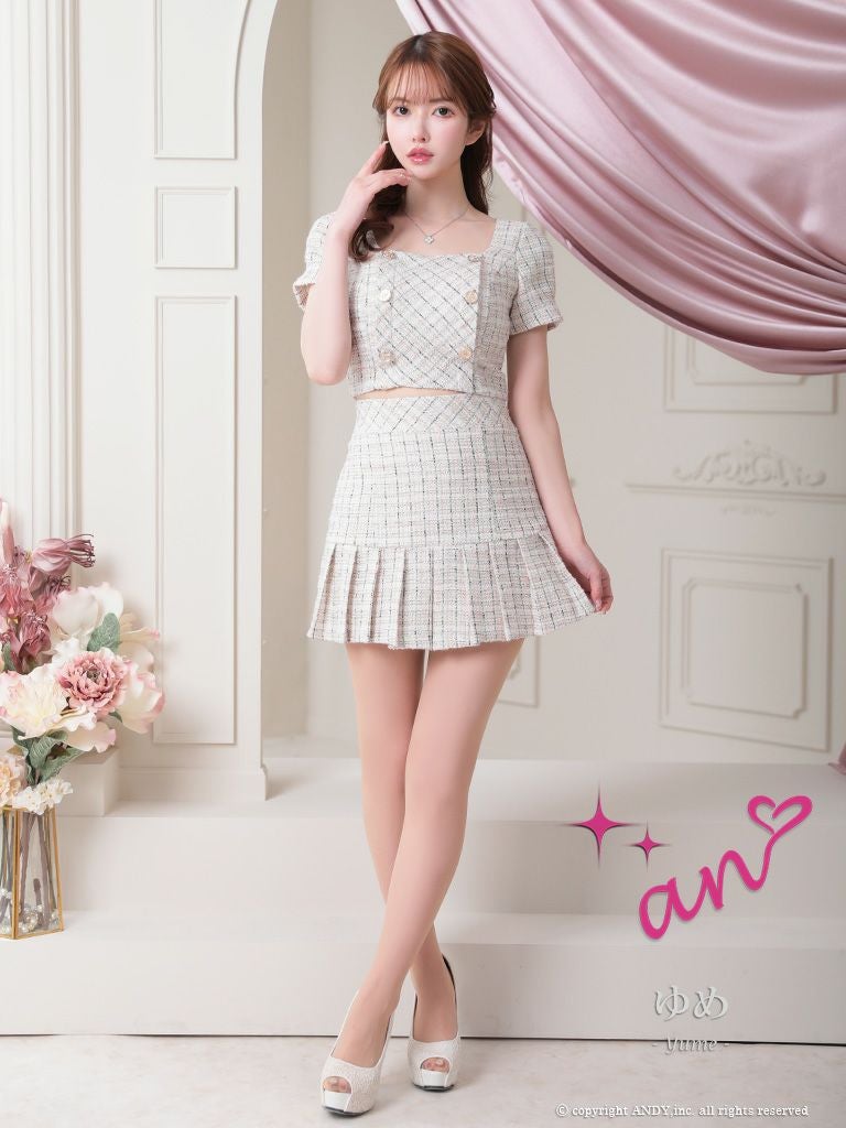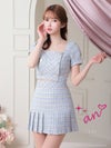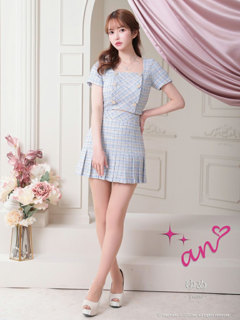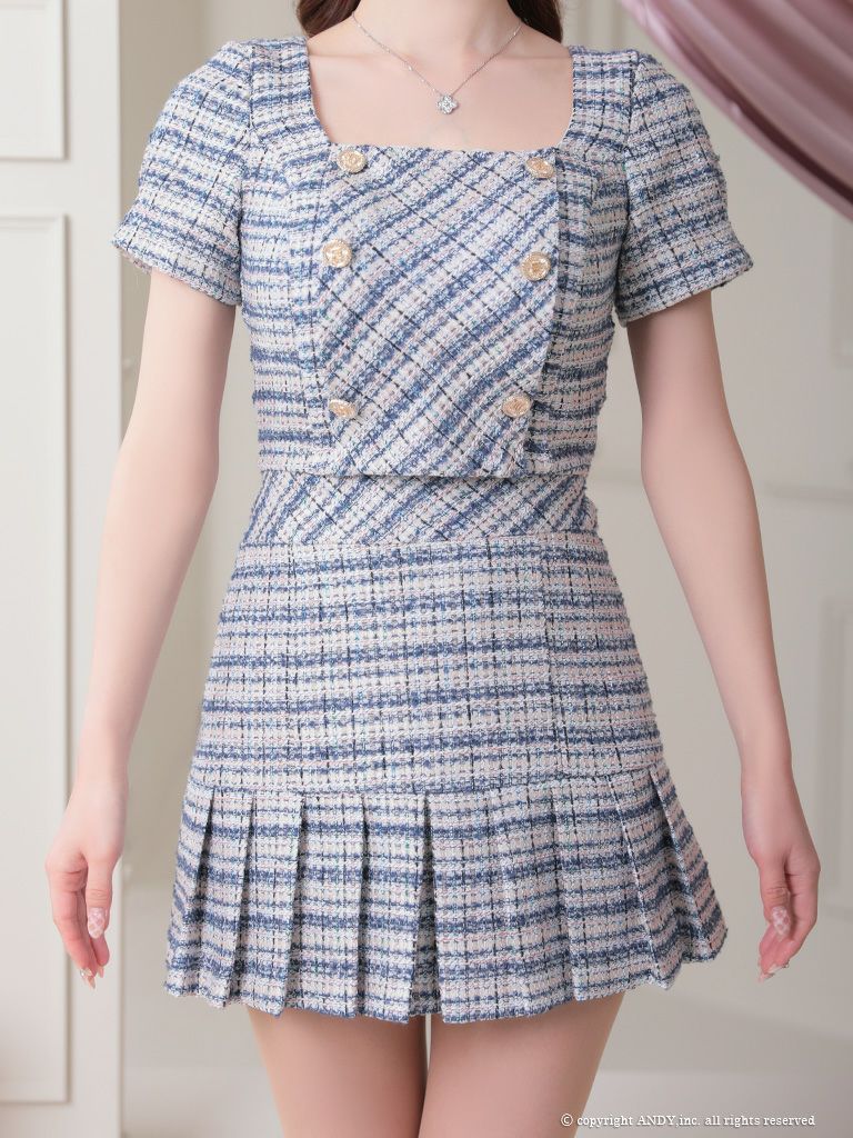 5. [an/アン] 高級ゴールドボタンチェック柄フレアセットアップ半袖ミニ丈ドレス
