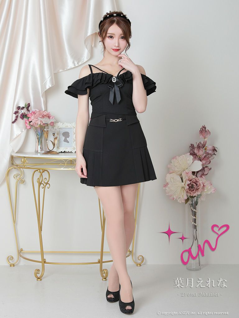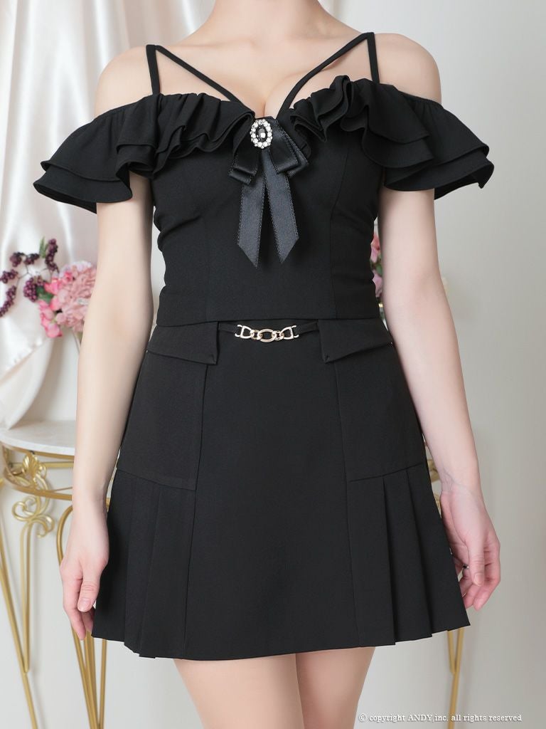 キャバドレス an アン 高級肩あきセットアップリボンブローチフリルワンカラーフレアミニドレス