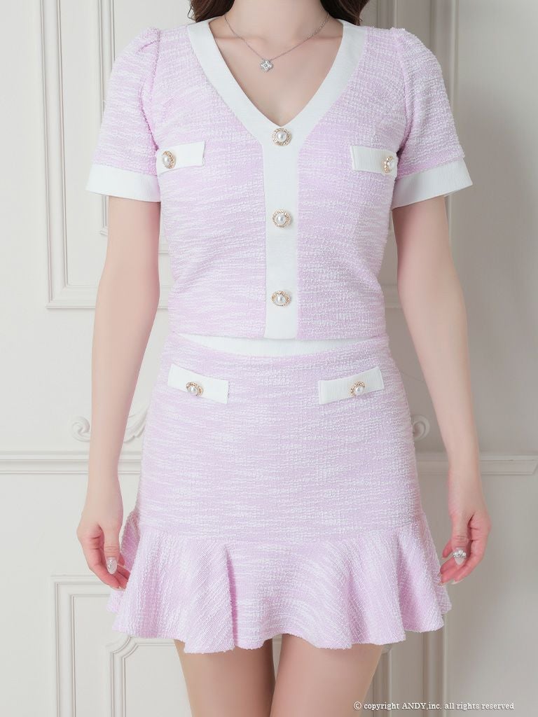 バイカラーラインとパールボタンがアクセント◎ [an/アン] 高級バイカラーツイードセットアップ半袖フレアミニドレス