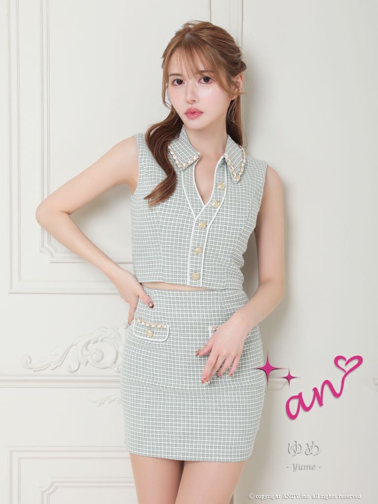 大人ガーリーを目指す☆ [an/アン] 高級 ノースリーブ 襟付き ツイード チェック柄 セットアップ ポケットデザイン ゴールドボタン タイトミニドレス