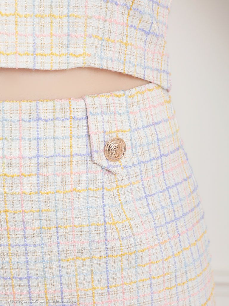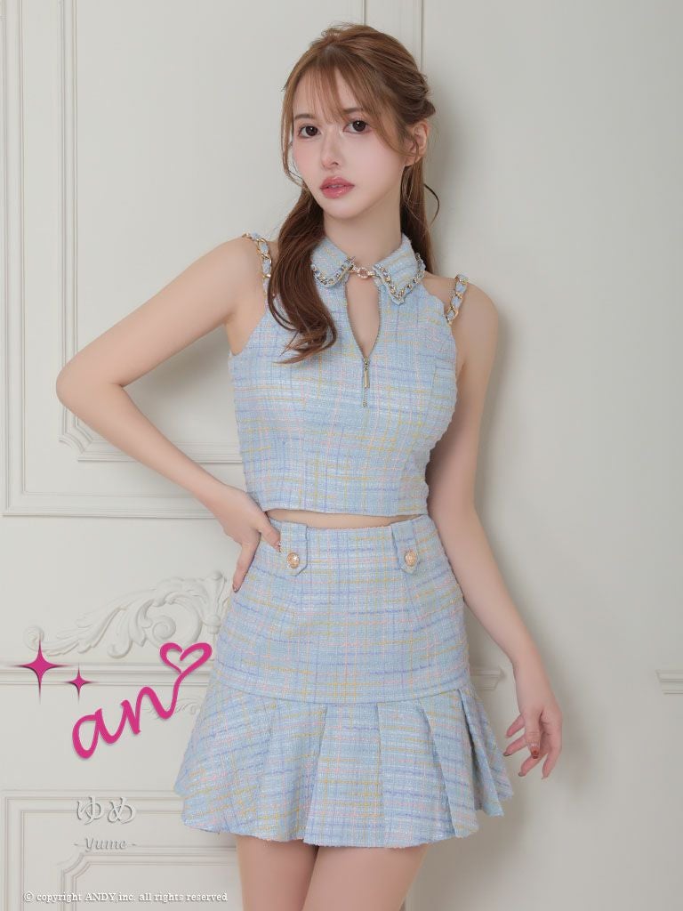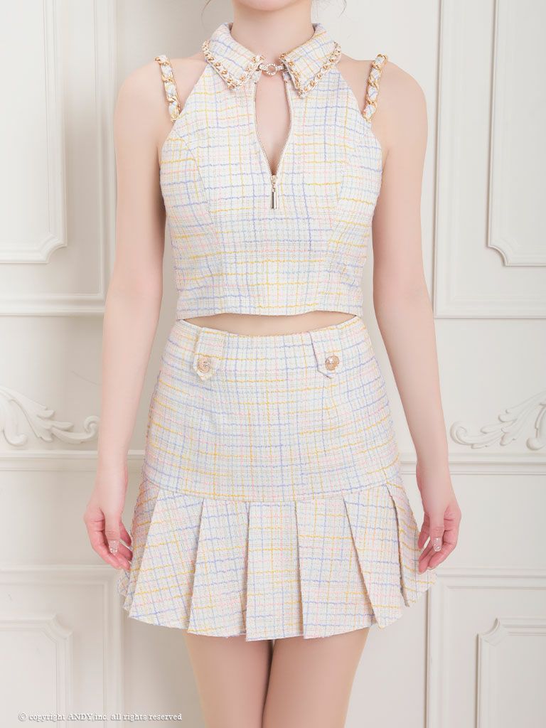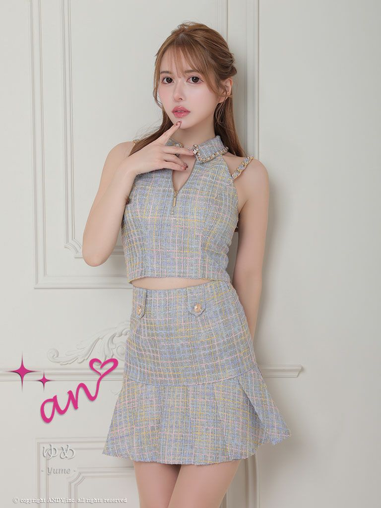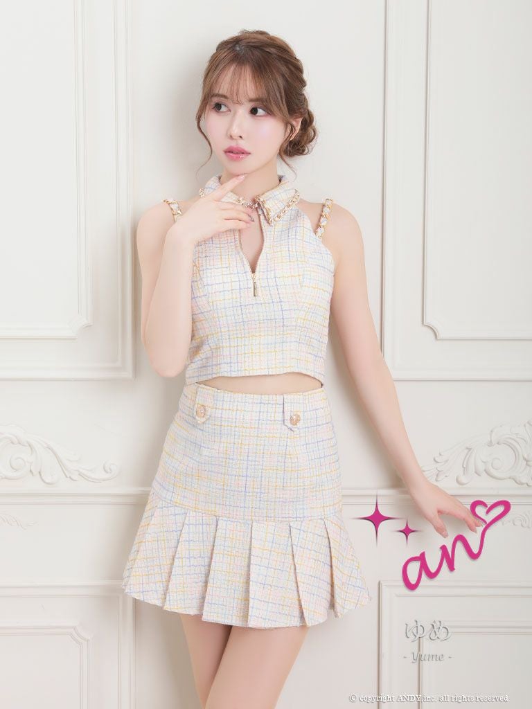 5. [an/アン] 高級 フロントジップ ホルターネック 襟付き チェック柄 セットアップ フレアミニドレス
