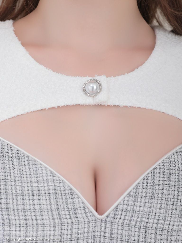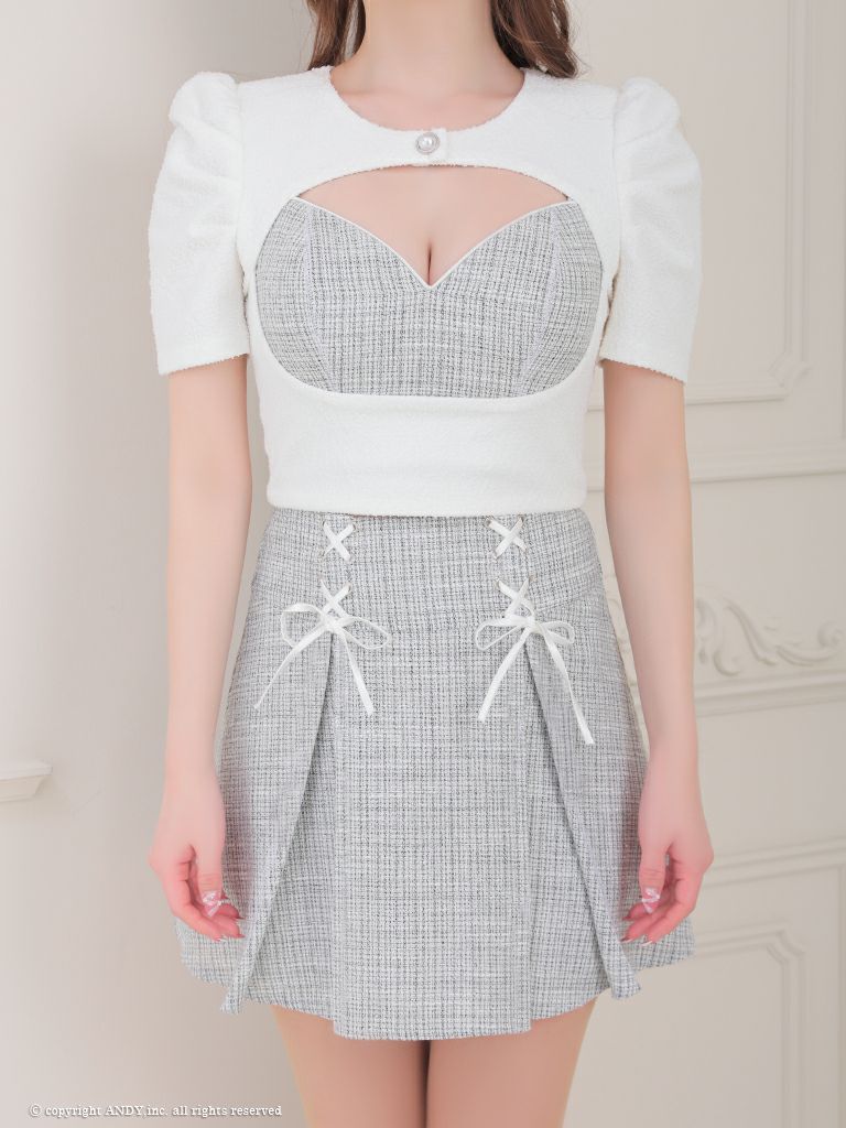 3. [an/アン] 高級 半袖 2way キャミソール セットアップ リボン バストカット パールボタン ツイード 谷間魅せ フレアミニドレス