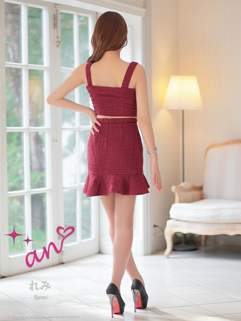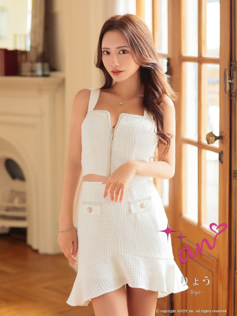 キャバドレス an アン 高級ノースリーブセットアップツイードジップフリルテールボタンタイトミニドレス