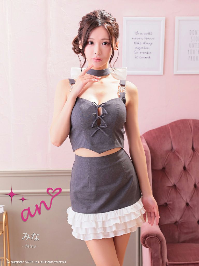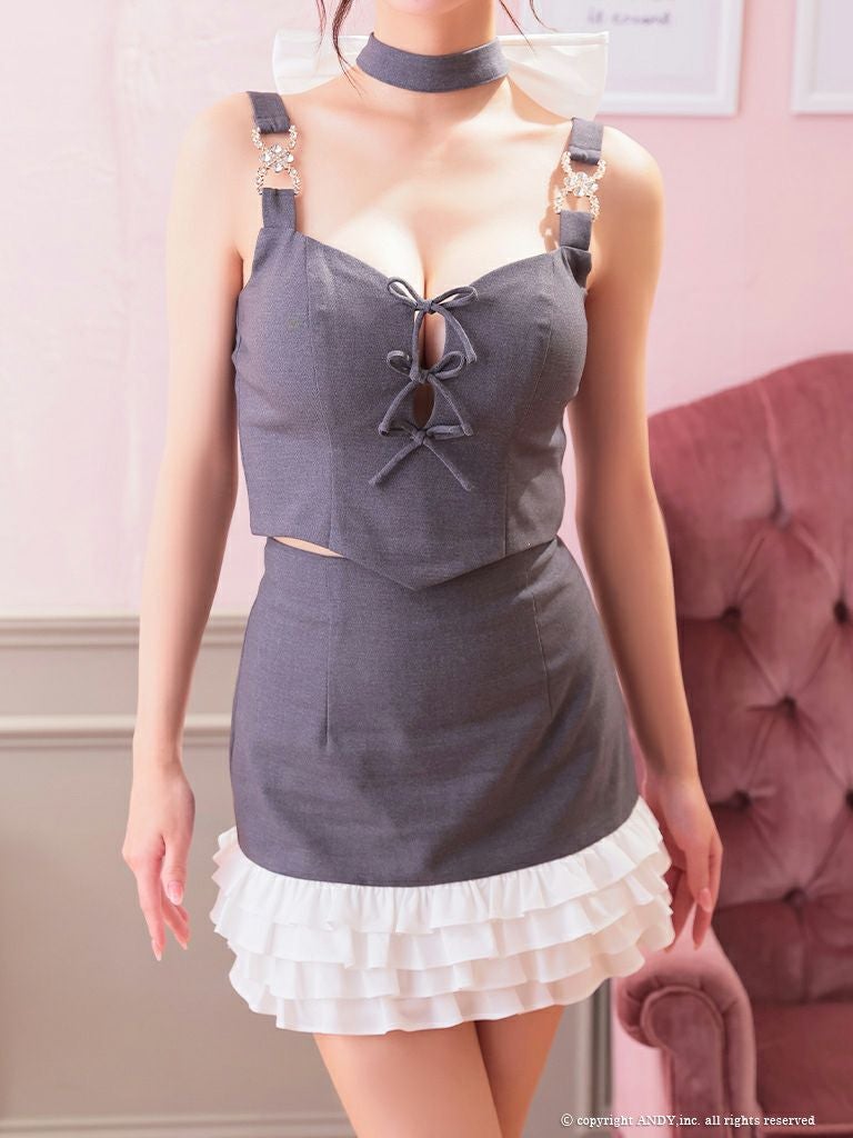 5. [an/アン] 高級 ノースリーブ セットアップ 裾フリル ネックリボン ビジュー バストカット 谷間魅せ タイトミニドレス