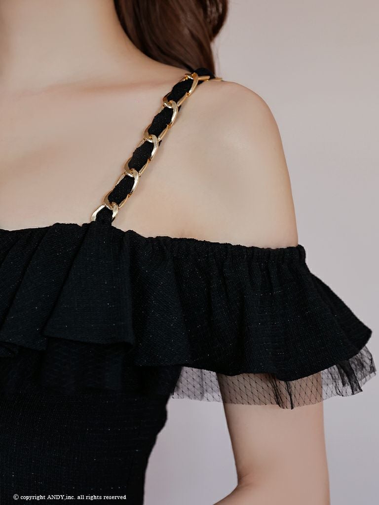 3. [an/アン] 高級 肩出し 二の腕カバー バストカット フリルチュール リボン プリーツ セットアップ 谷間魅せ フレアミニドレス