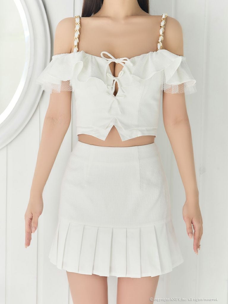 5. [an/アン] 高級 肩出し 二の腕カバー バストカット フリルチュール リボン プリーツ セットアップ 谷間魅せ フレアミニドレス