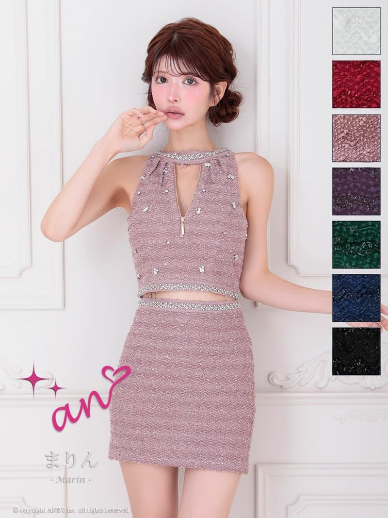 キャバドレス an アン ノースリーブ ジップ ツイード ビジュー セットアップ タイト ミニドレス