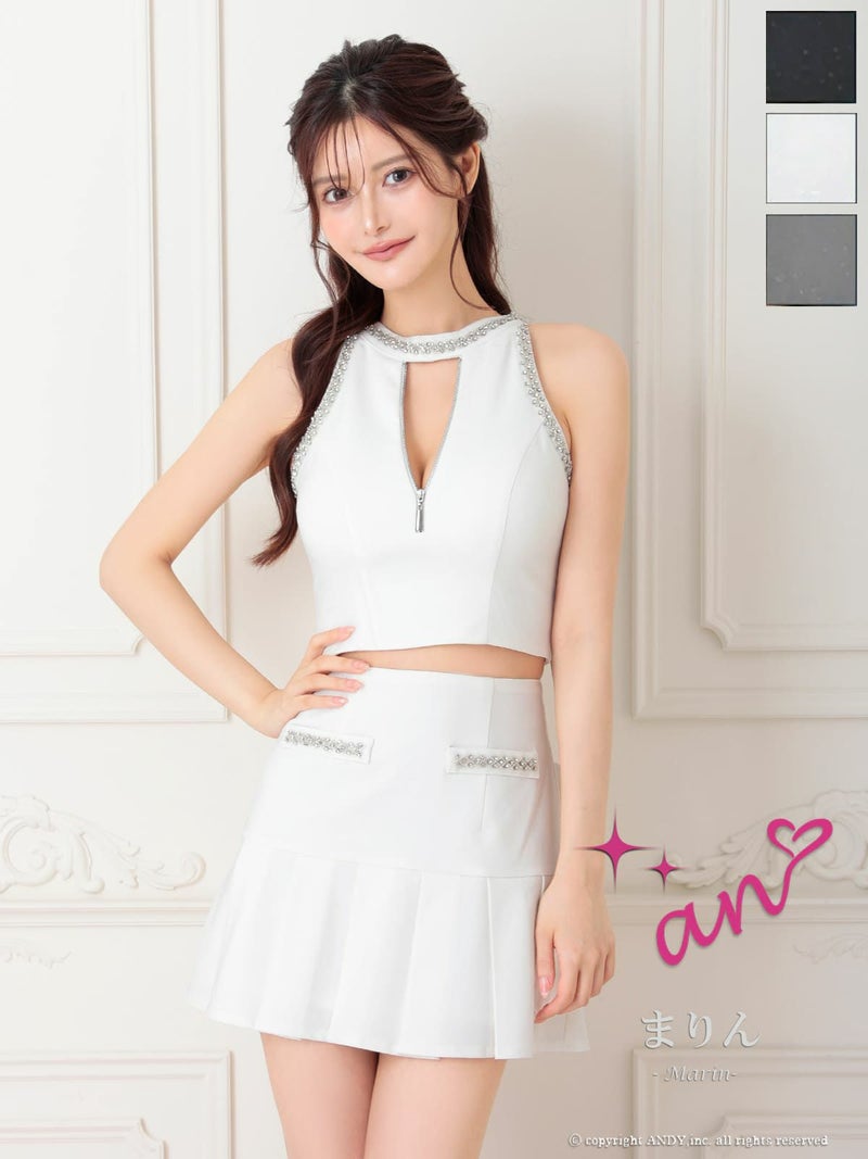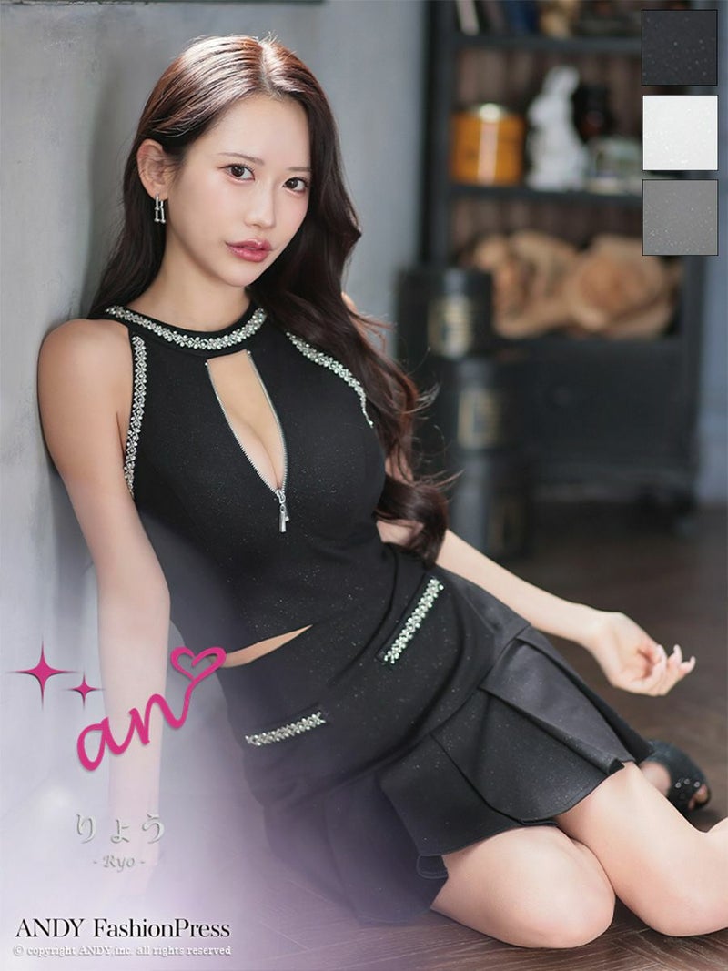 3. [an/アン] 高級 ノースリーブ ビジュー フロントジップ 谷間魅せ セットアップ プリーツ フレアミニドレス