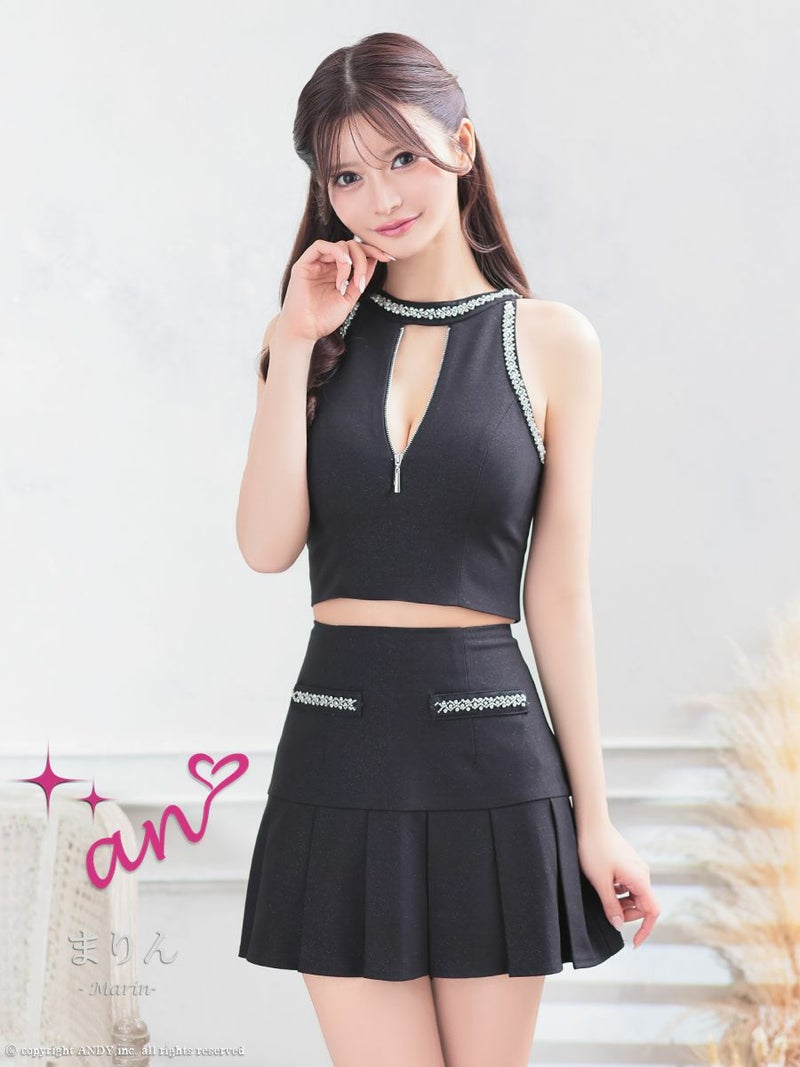 谷間をsexyに強調♡ [an/アン] 高級 ノースリーブ ビジュー フロントジップ 谷間魅せ セットアップ プリーツ フレアミニドレス