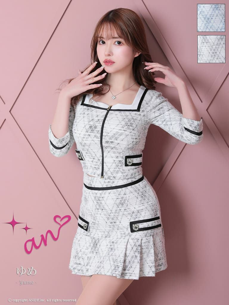 キャバドレス An アン 袖あり チェック スクエアネック ジップ セットアップ フレアミニドレス