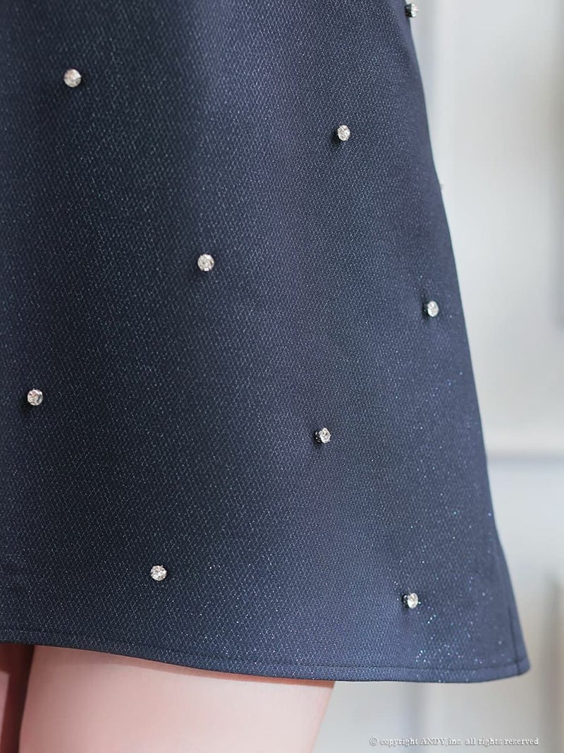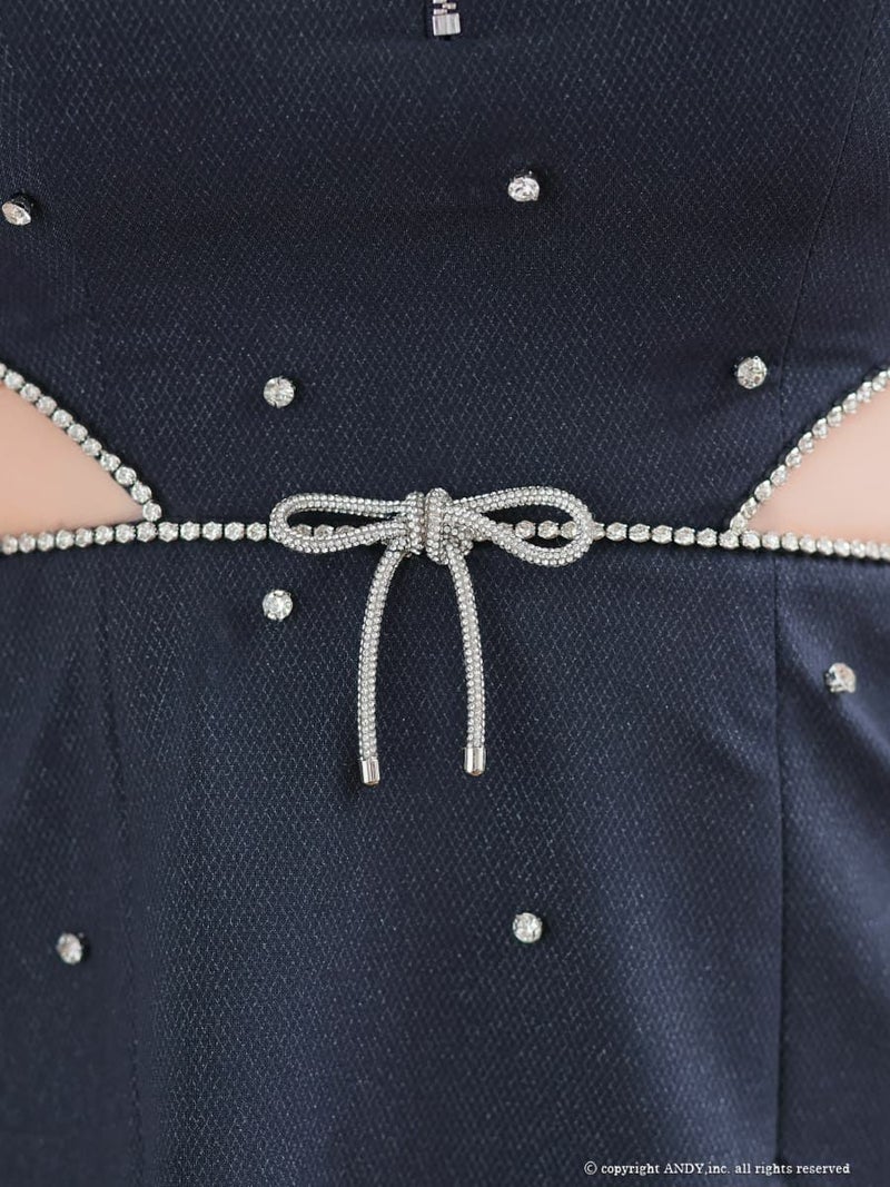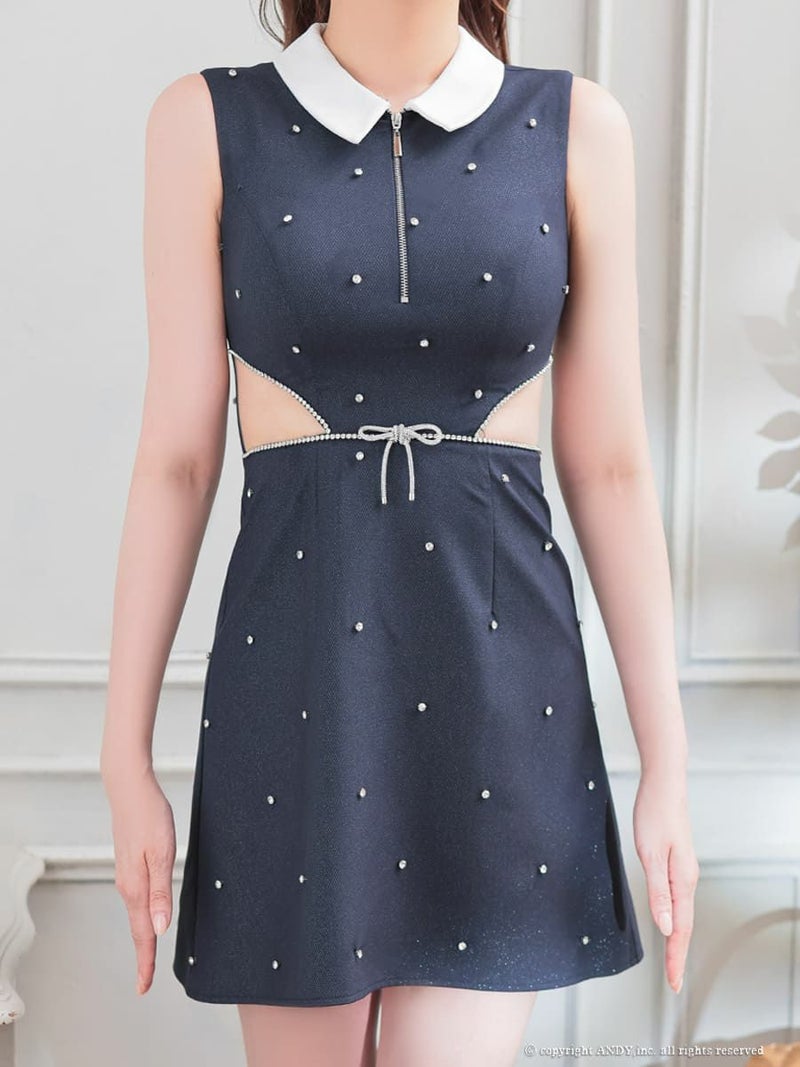 5. [an/アン] 高級 ノースリーブ ジップ ワンカラー ビジュー 襟付き くびれ リボン フレア ミニドレス