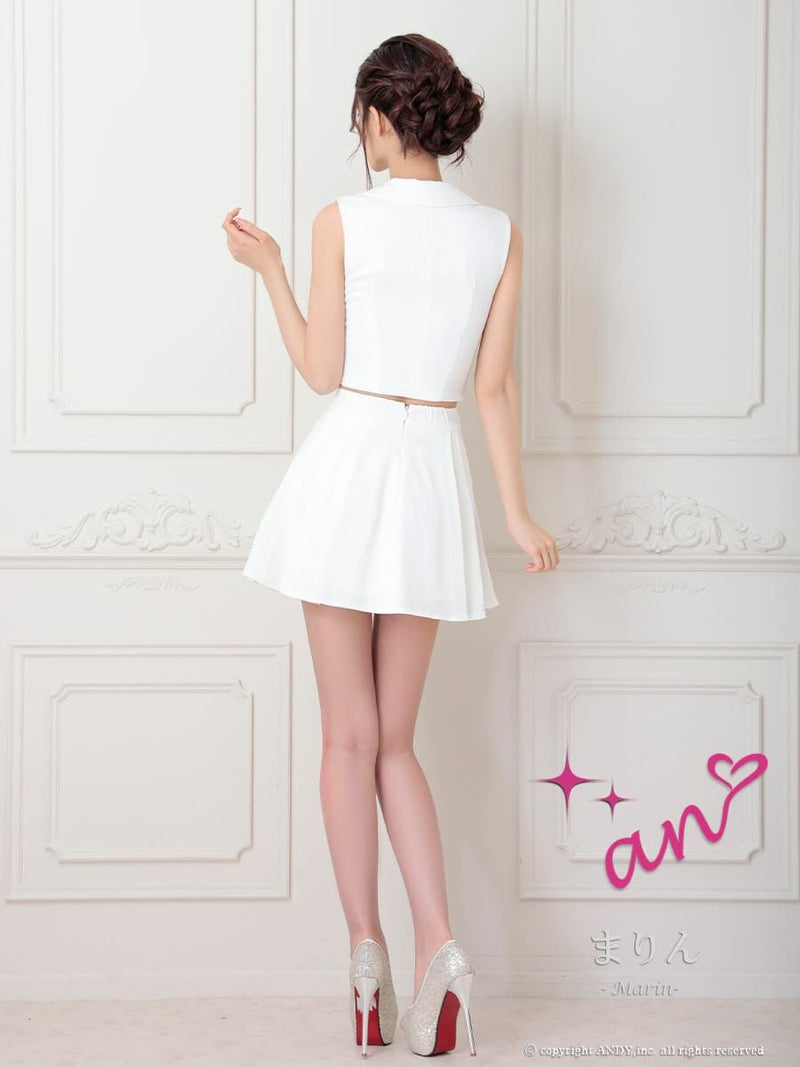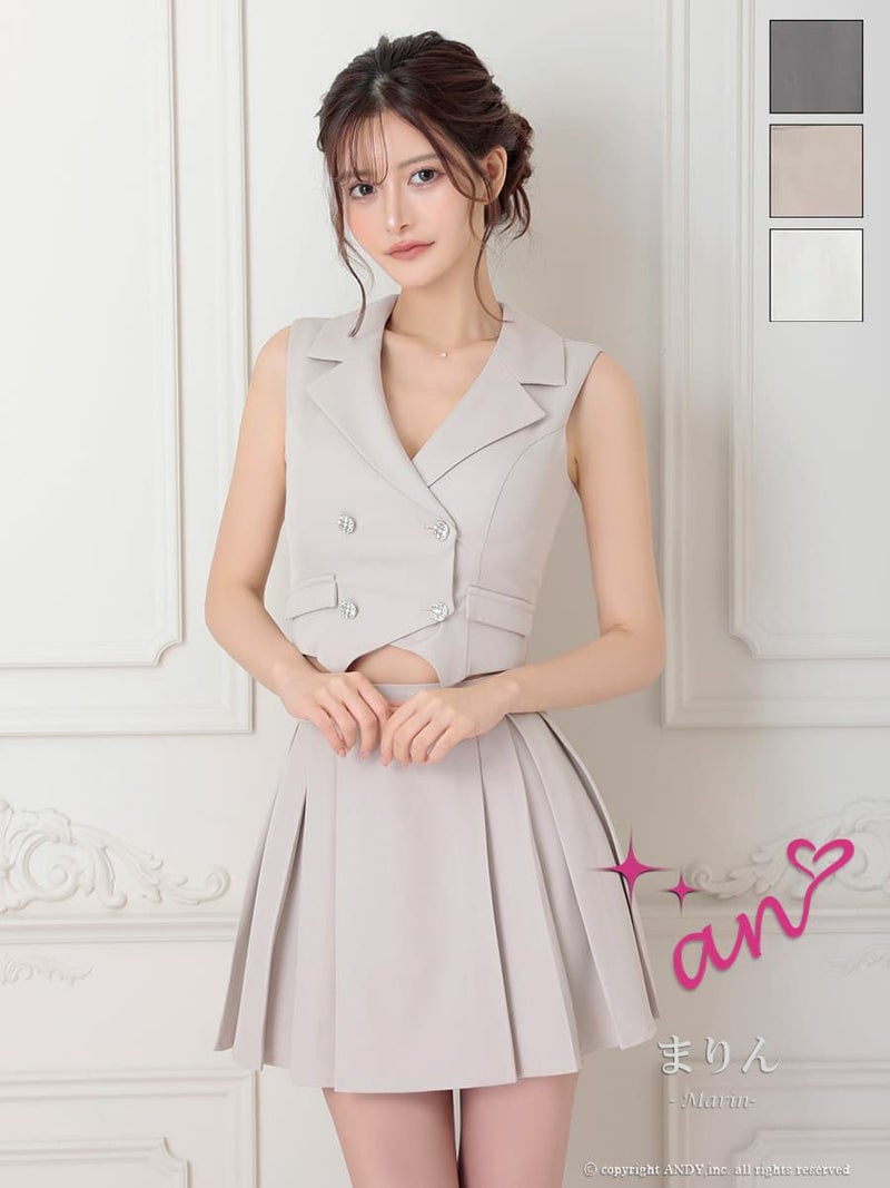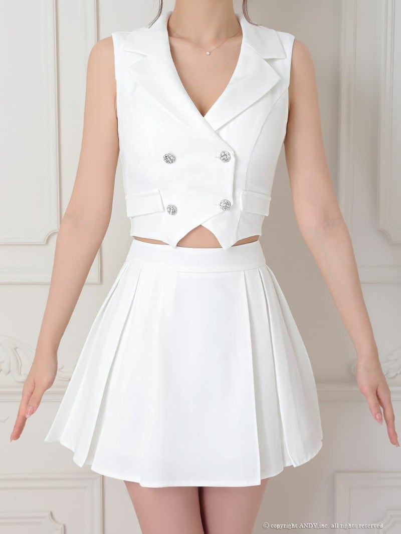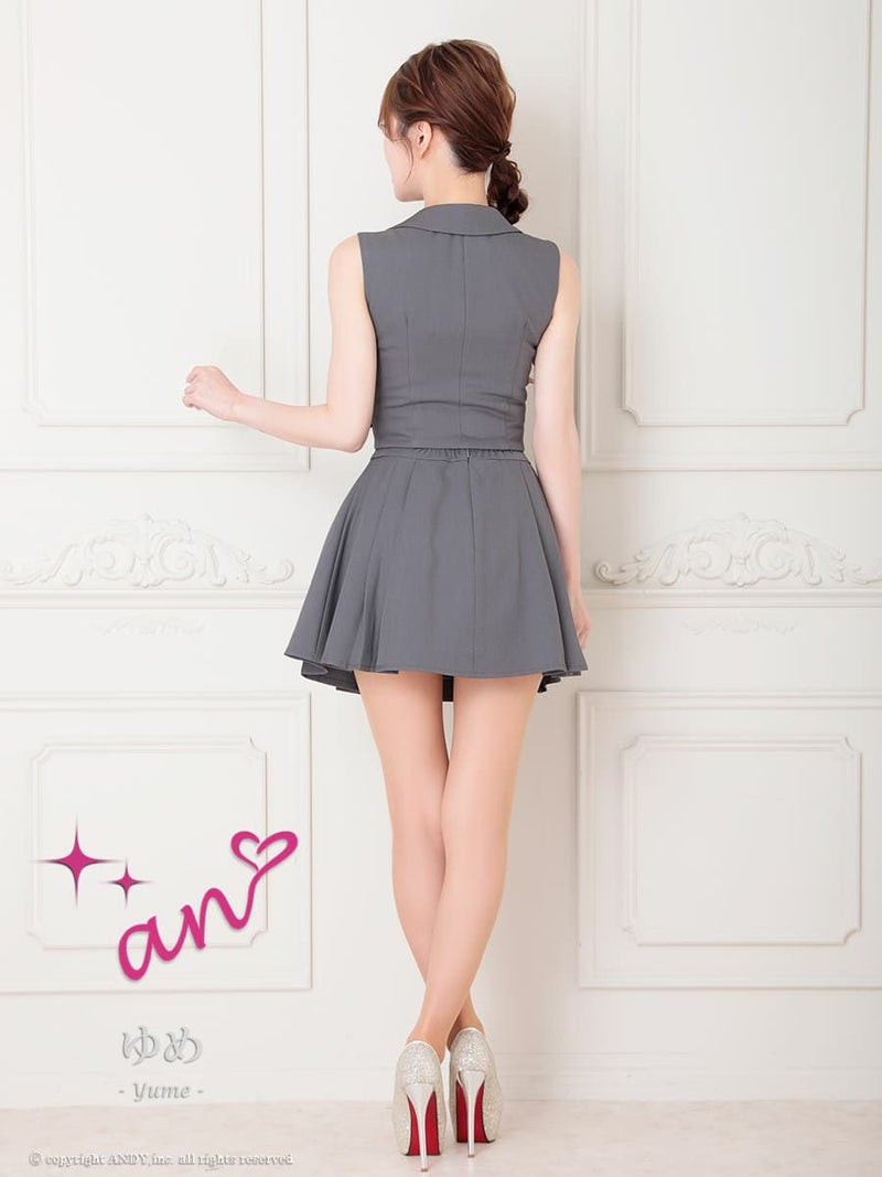 ヘルシーな肌魅せがあざとい★ [an/アン] 高級 ノースリーブ 襟付き ワンカラー プリーツ ボタン ポケット セットアップ フレア ミニドレス