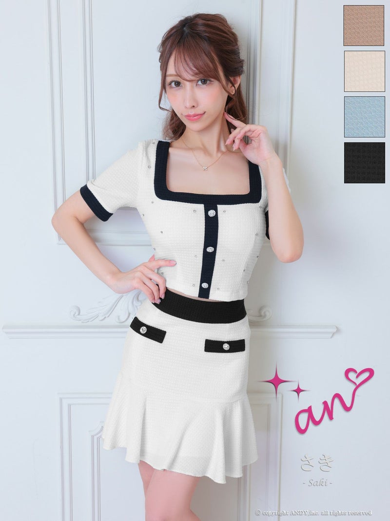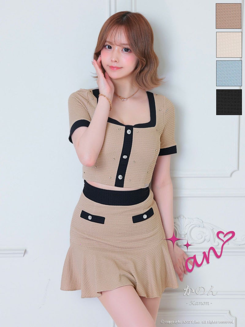 同伴やアフターにも♪ [an/アン] 高級 セットアップ ワンカラー ワッフル 半袖 ビジュー フレアミニドレス