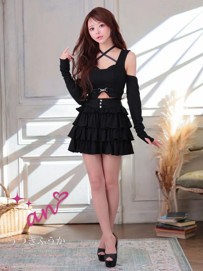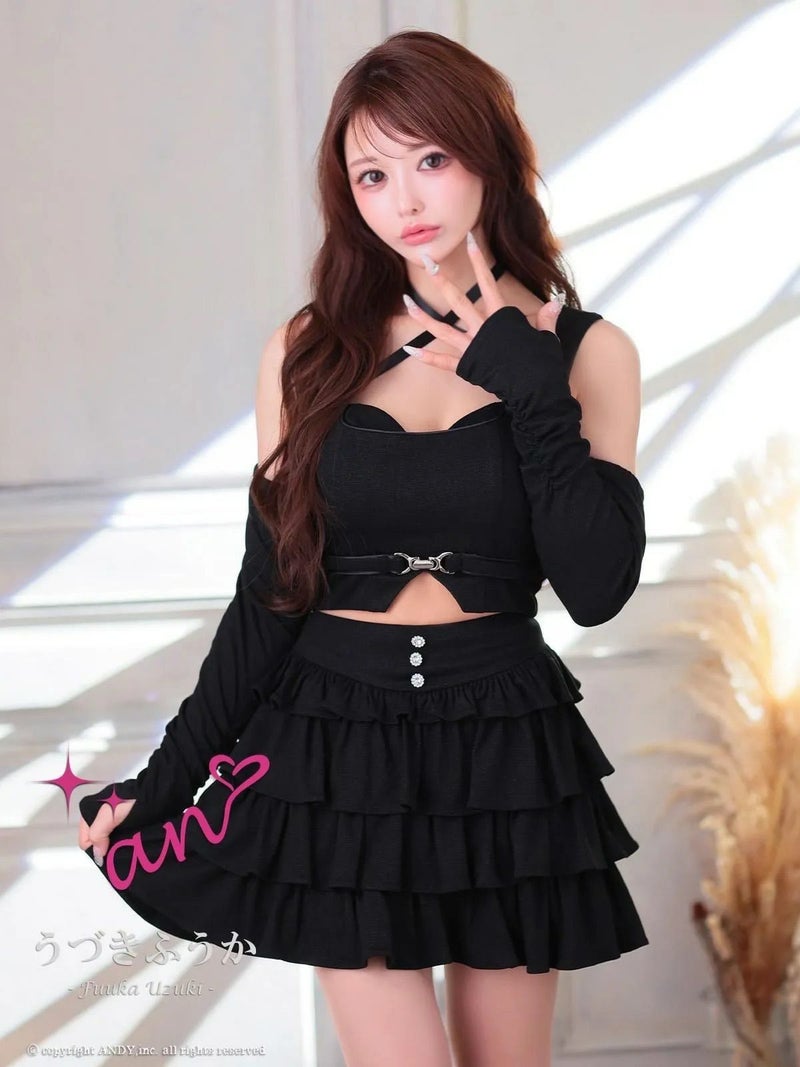 キャバドレス an アン 高級 ノースリーブ 2way 袖取り外し可能 ウエストベルト ワンカラー フリル ティアード セットアップ フレア ミニドレス
