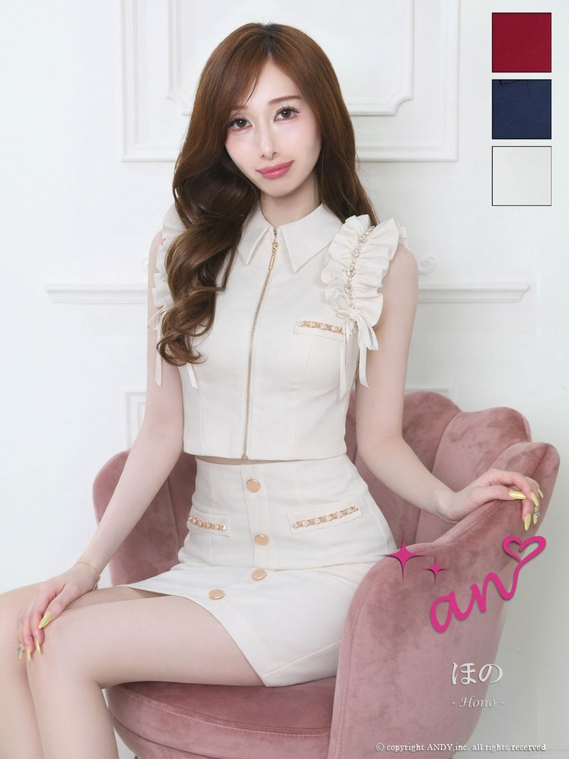 キャバドレス an アン 高級 ブランド タイト ミニドレス ノースリーブ セットアップ 襟付き ジップ 袖口フリル チェーンデザイン ボタン リボン