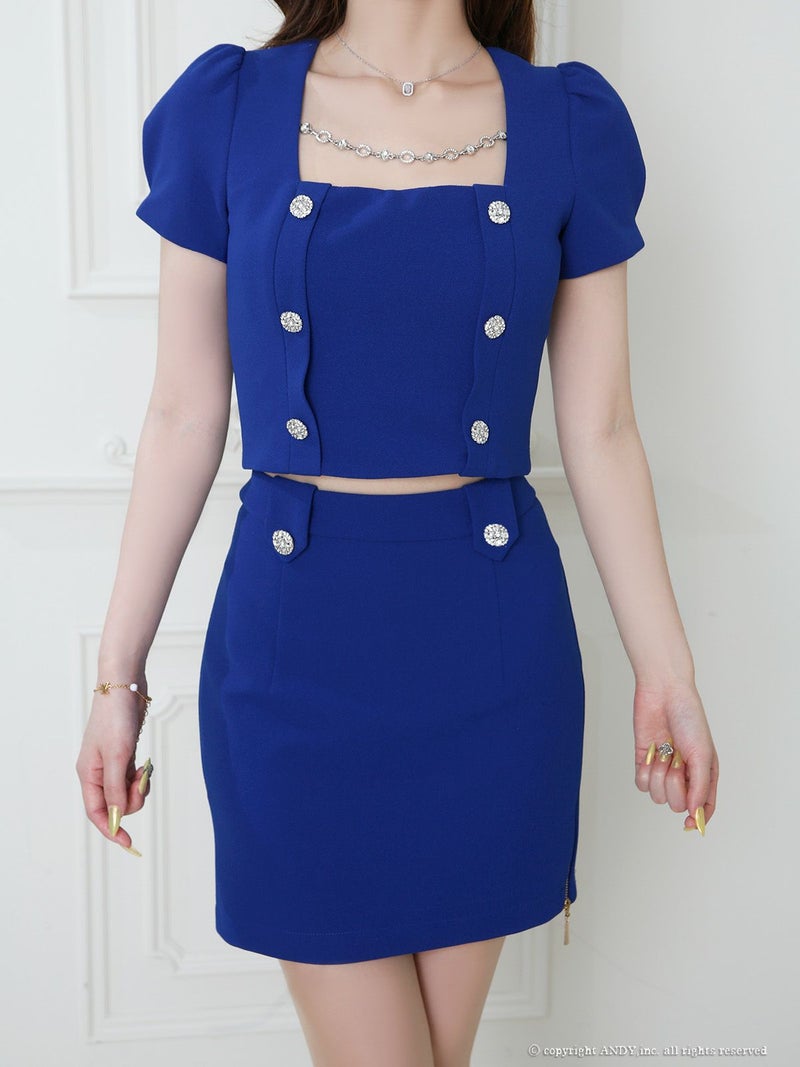 5. [an/アン] 高級 ブランド タイトミニドレス セットアップ シンプル 背中魅せ 半袖 ジップ スクエアネック ビジューボタン ワンカラー