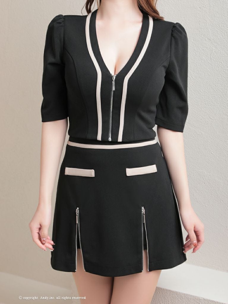 セクシーなセットアップデザイン☆ [AndyGLAMOROUS/アンディグラマラス] 高級 ジップ セットアップ 袖あり ファスナースリット フレアミニドレス