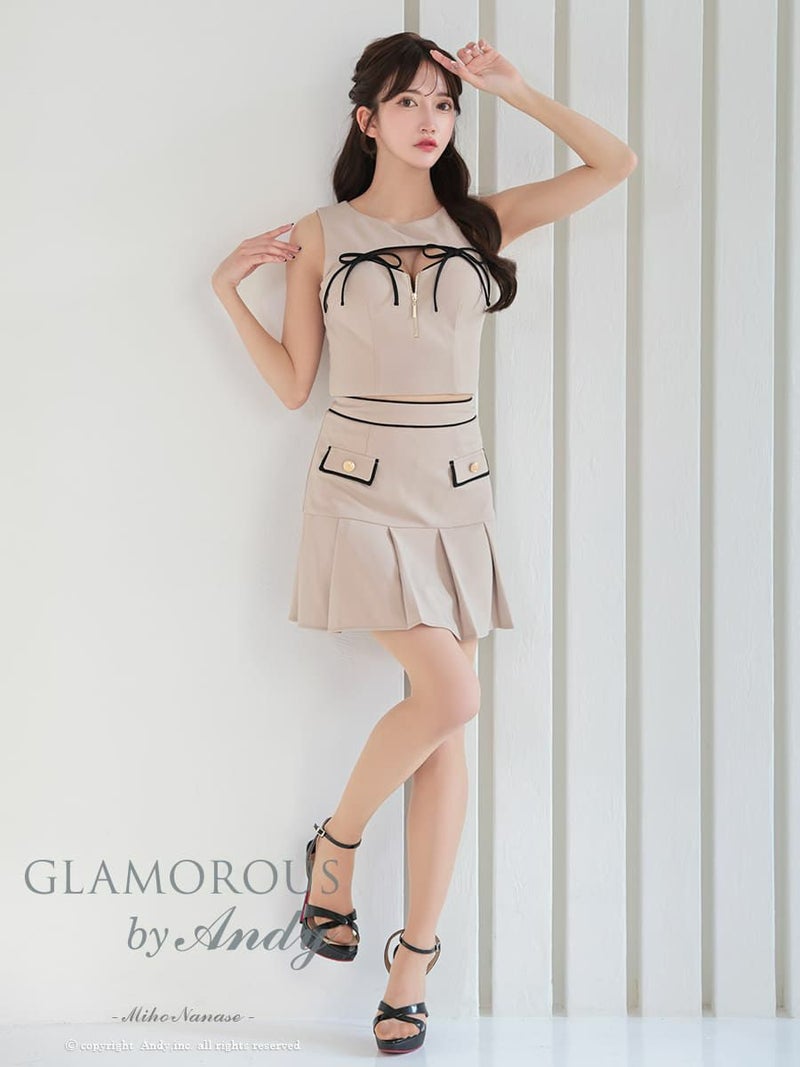 胸元のリボンが甘かわいい★ [AndyGLAMOROUS/アンディグラマラス] 高級 セットアップ ジップ リボンノースリーブ ポケット 谷間魅せ フレアミニドレス