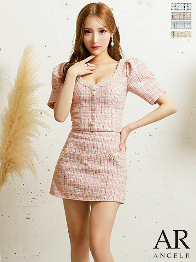 華やかながらも上品な印象に☆ [Angel-R/エンジェルアール] 高級デコルテパールビジューチェック柄パフスリーブ半袖セットアップツイードマイクロタイトミニドレス