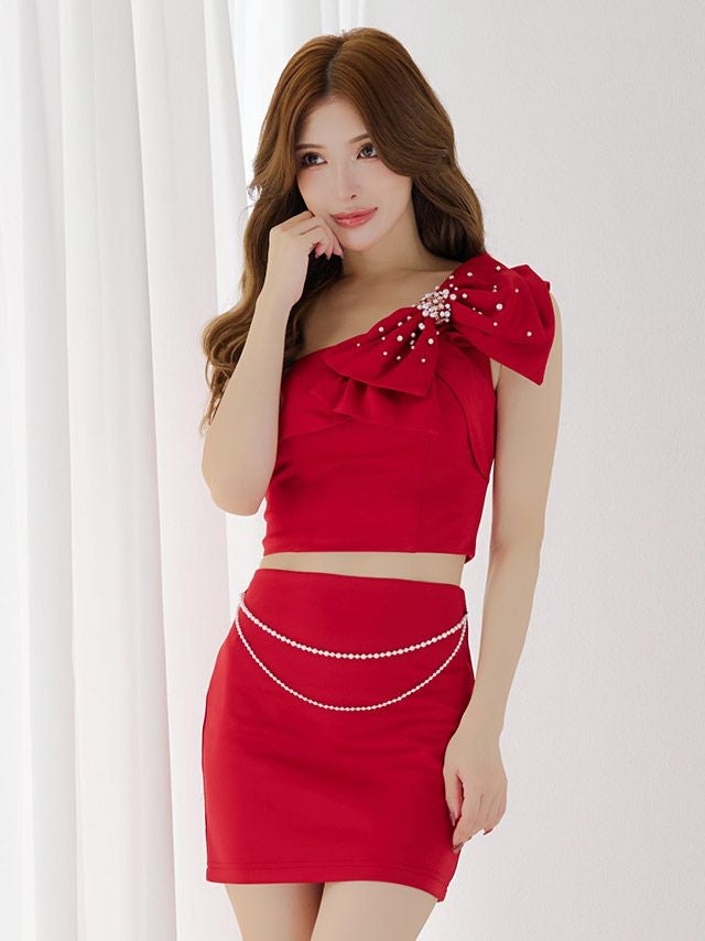 セットアップでスタイルアップ効果抜群♪ SUPER SALE [Angel-R/エンジェルアール] 高級 ブランド タイトミニドレス セットアップ ワンショルダー ビックリボン パールチェーン (ゆんころ着用)