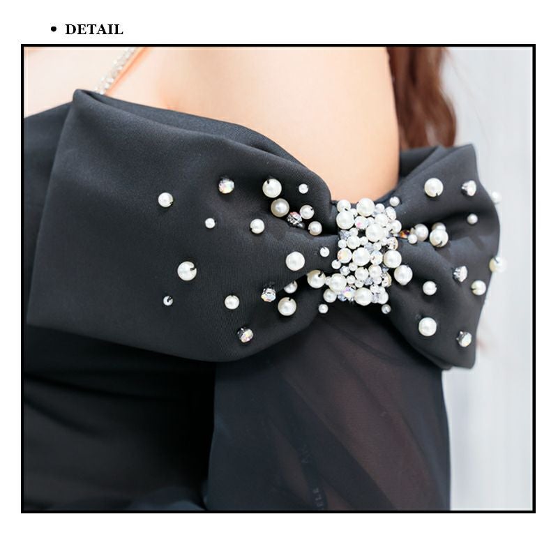 5. [Angel-R/エンジェルアール] 高級 肩出し 二の腕カバー セットアップ パールビジュー リボン 長袖 袖あり バストカット 谷間魅せ タイトミニドレス
