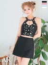 セットアップでスタイルアップ効果抜群☆ [Angel-R/エンジェルアール] 高級 ホルターネック バストカット ビジュー パールボタン セットアップ 谷間魅せ フレアミニドレス