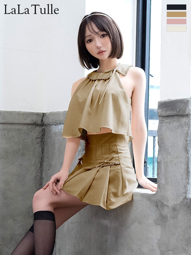 上品さも漂うセットアップ♡ [Angel-R/エンジェルアール] 高級 ブランド Aラインミニドレス ホルターネック 胸元カバー セットアップ 襟付き チェーン リボン プリーツ (せな着用)