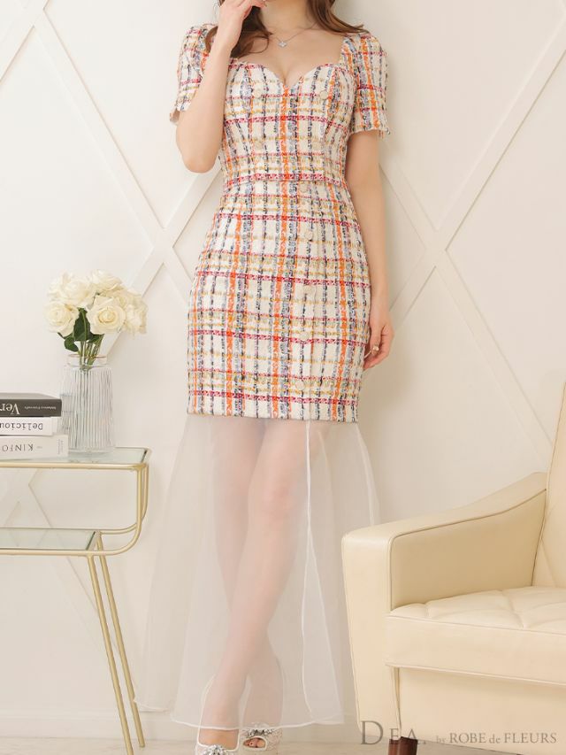 5. [DEA.byROBEdeFLEURS/ディアバイローブドフルール] 高級ラメツイードデコルテハートカットフレアオーガンジーワンピースセットアップ半袖タイト膝丈ドレス