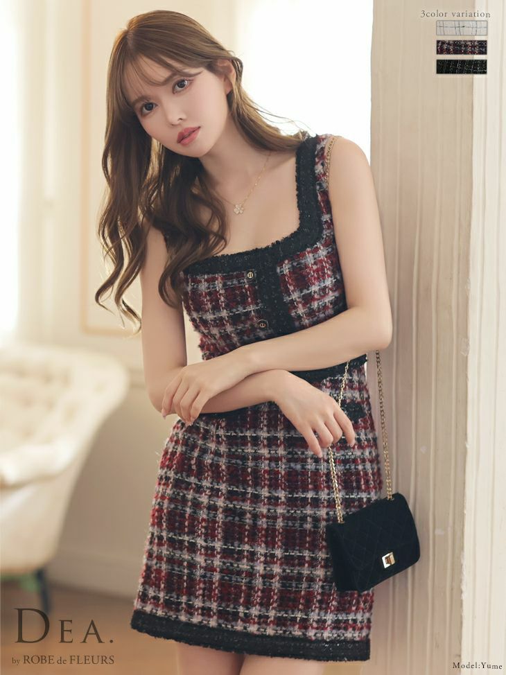 DEA.byROBEdeFLEURS ディアバイローブドフルール 高級ラメツイードチェック柄ボタンセットアップノースリーブタイトミニドレス