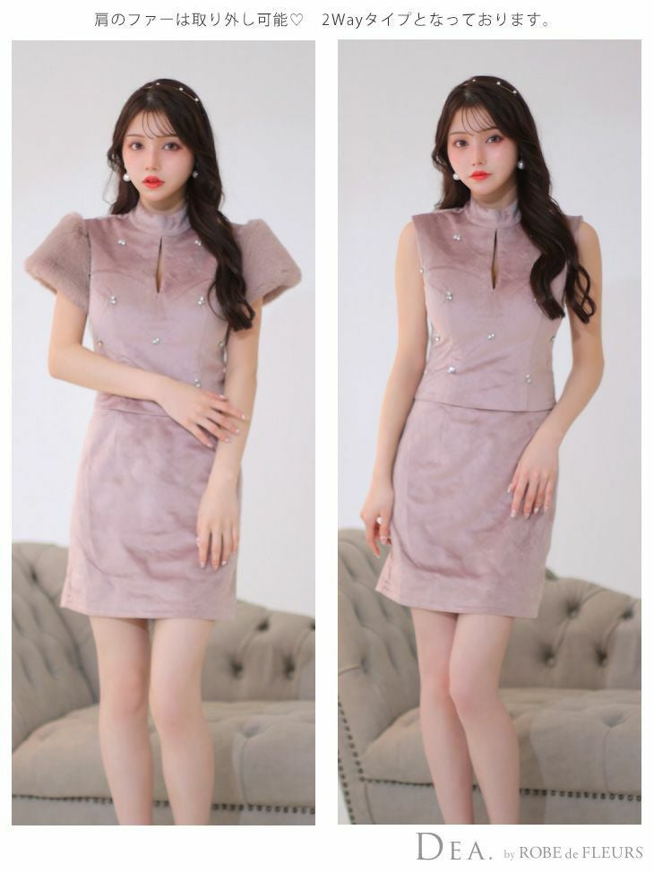 ファーは取り外しができるので気分やシーズンによって付け替えが可能です♡ [DEA.byROBEdeFLEURS/ディアバイローブドフルール] 高級ファー×ベルベットセットアップ半袖タイトミニドレス