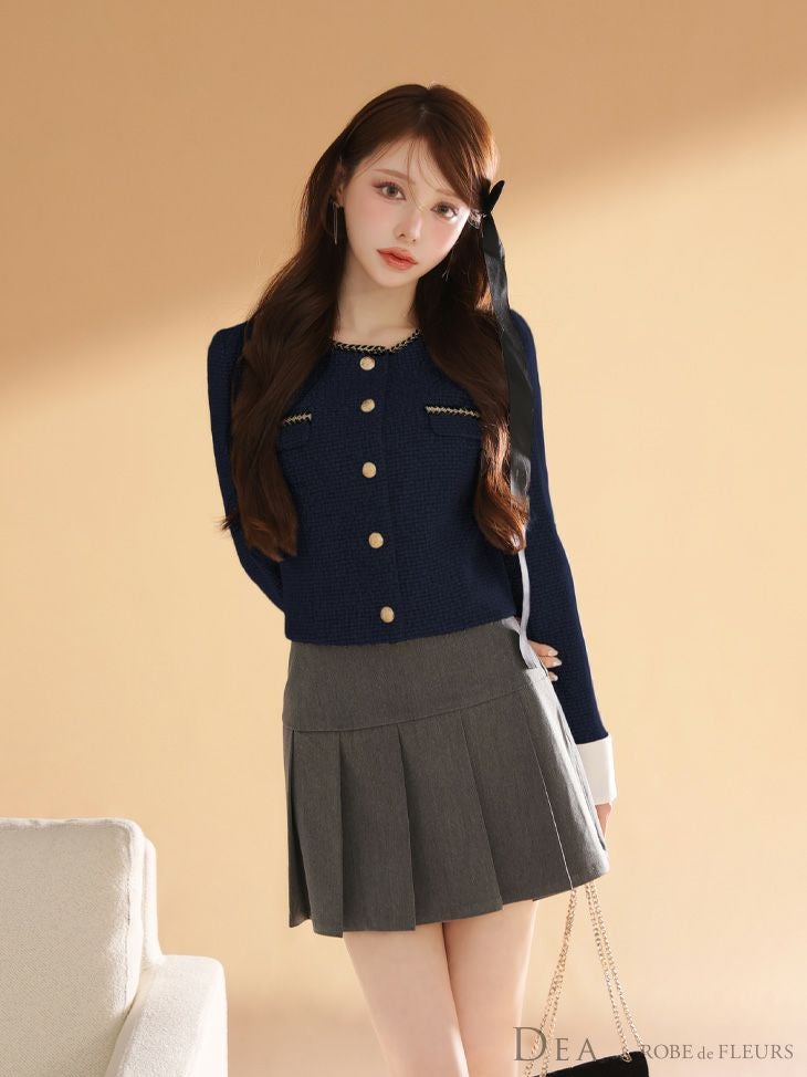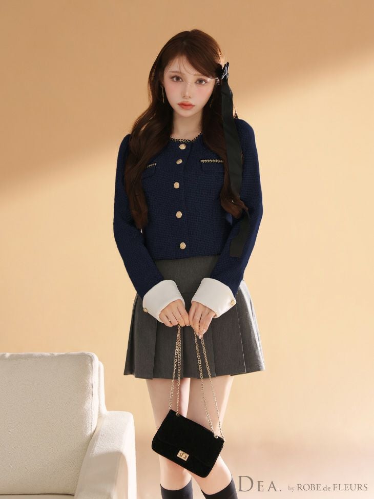 6. [DEA.byROBEdeFLEURS/ディアバイローブドフルール] 高級 ブランド Aラインミニドレス 長袖 セットアップ ツイード フロントボタン プリーツ