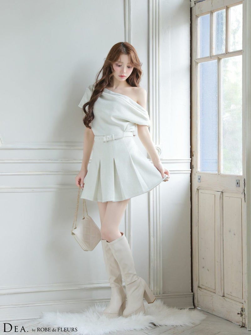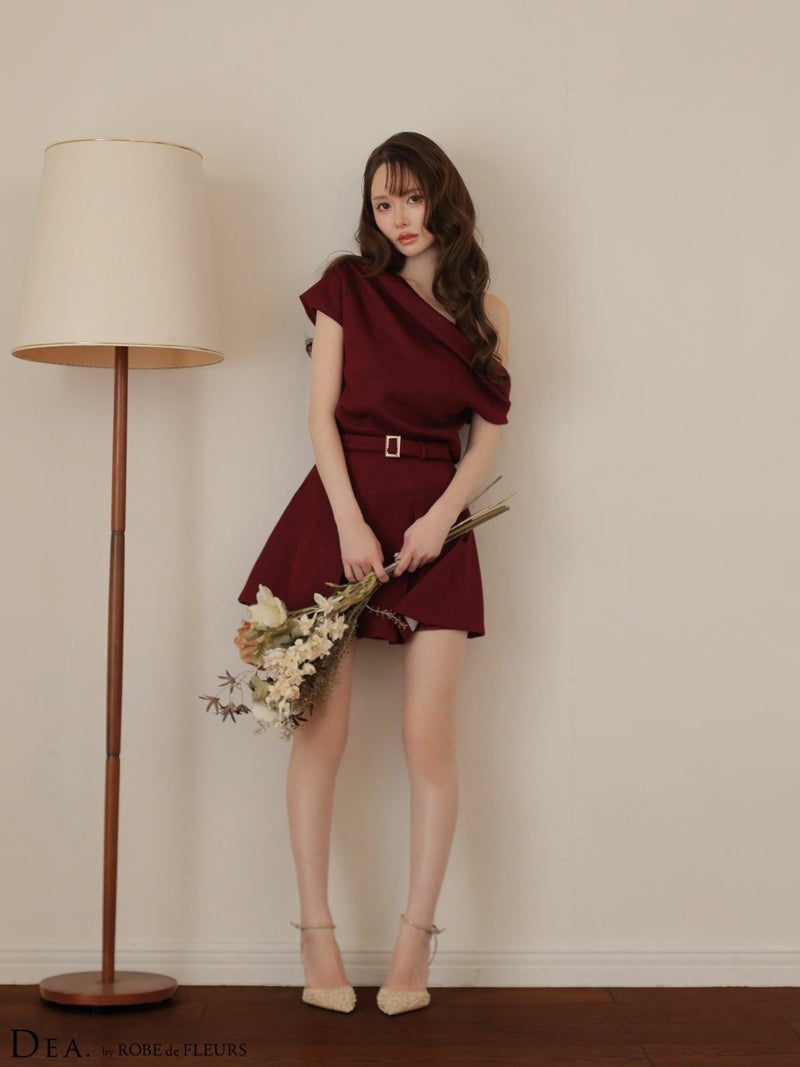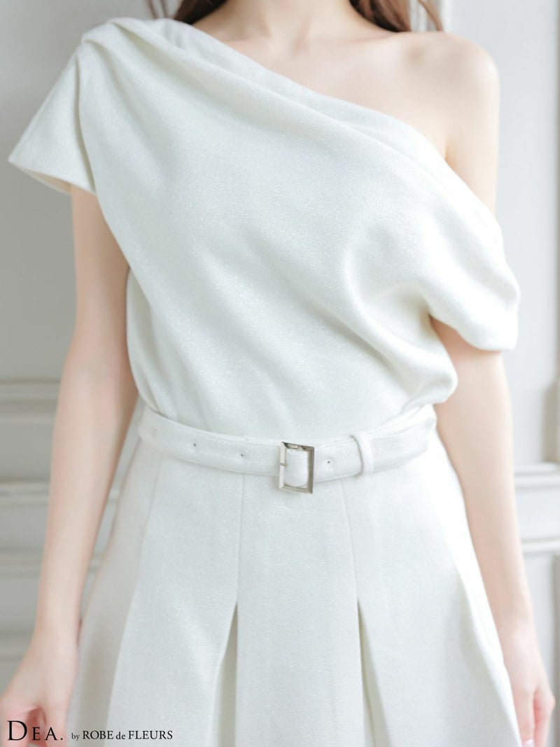 ベルトがお洒落にメリハリをプラス♡ [DEA.byROBEdeFLEURS/ディアバイローブドフルール] 高級 ブランド Aラインミニドレス セットアップ オフショルダー ウエストベルト ドレープ プリーツ ワンカラー ラメニット