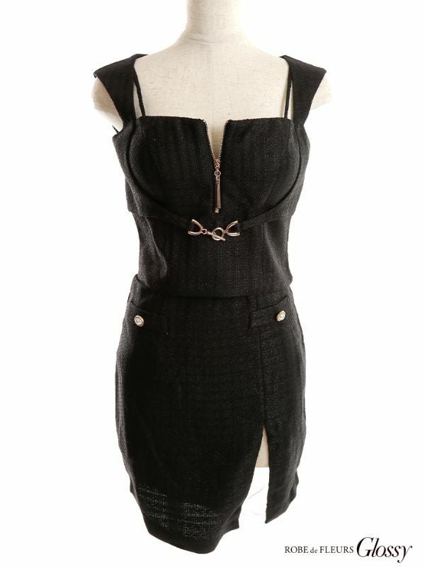 高級感溢れるsexyドレス☆ SUPER SALE [ROBEdeFLEURSGlossy/ローブドフルールグロッシー] 高級ワンカラーツイードセットアップフロントジップシアーカットノースリーブタイトミニドレス