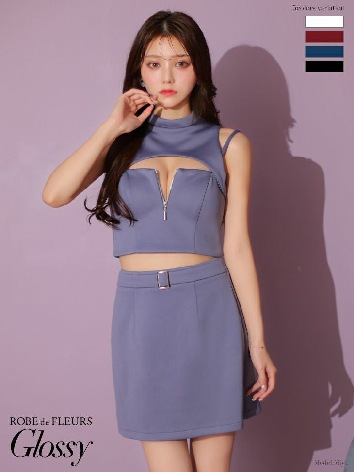 着心地も抜群のストレッチ性のある生地☆ [ROBEdeFLEURSGlossy/ローブドフルールグロッシー] 高級 ハイネック バストカット ジップ ノースリーブ セットアップ ウエストベルト 谷間魅せ タイトミニドレス