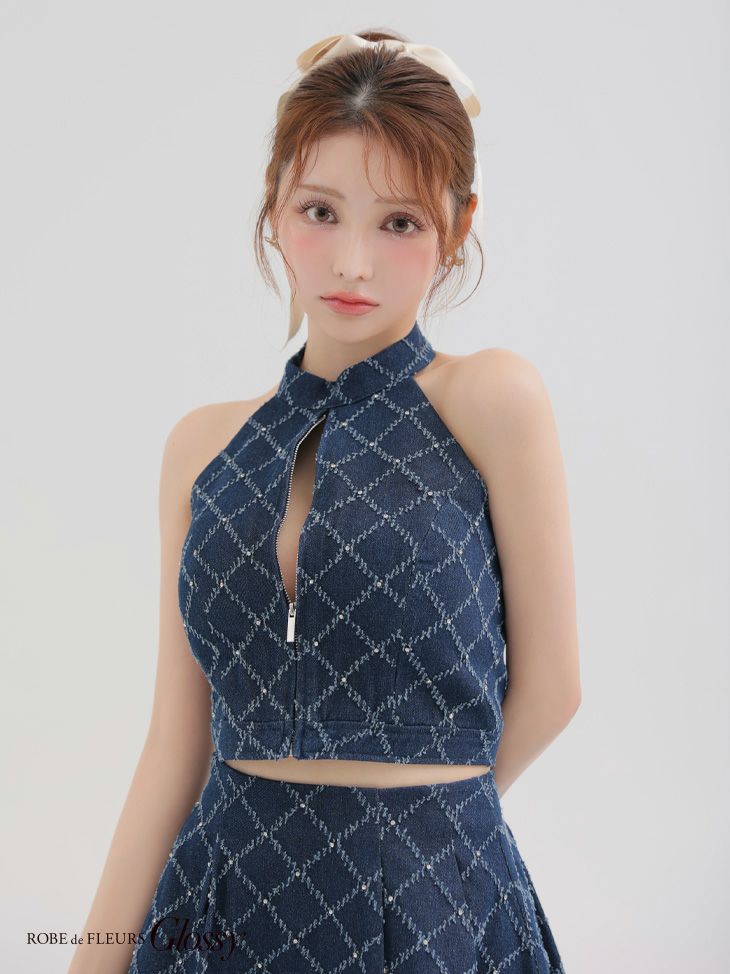 ジップでセクシーに谷間魅せ☆ [ROBEdeFLEURSGlossy/ローブドフルールグロッシー] 高級 ブランド Aラインミニドレス ホルターネック セットアップ ジップ デニム