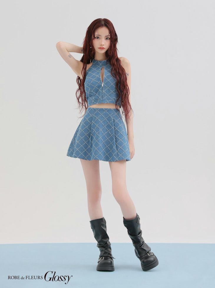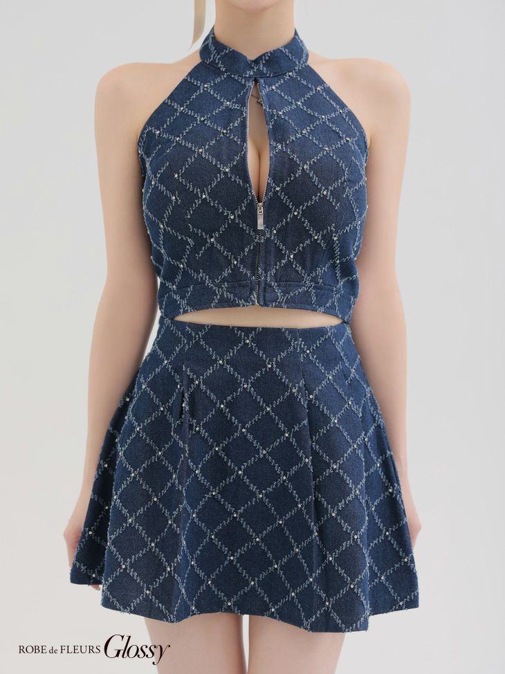 CUTEな愛されシルエットをメイク♡ [ROBEdeFLEURSGlossy/ローブドフルールグロッシー] 高級 ブランド Aラインミニドレス ホルターネック セットアップ ジップ デニム