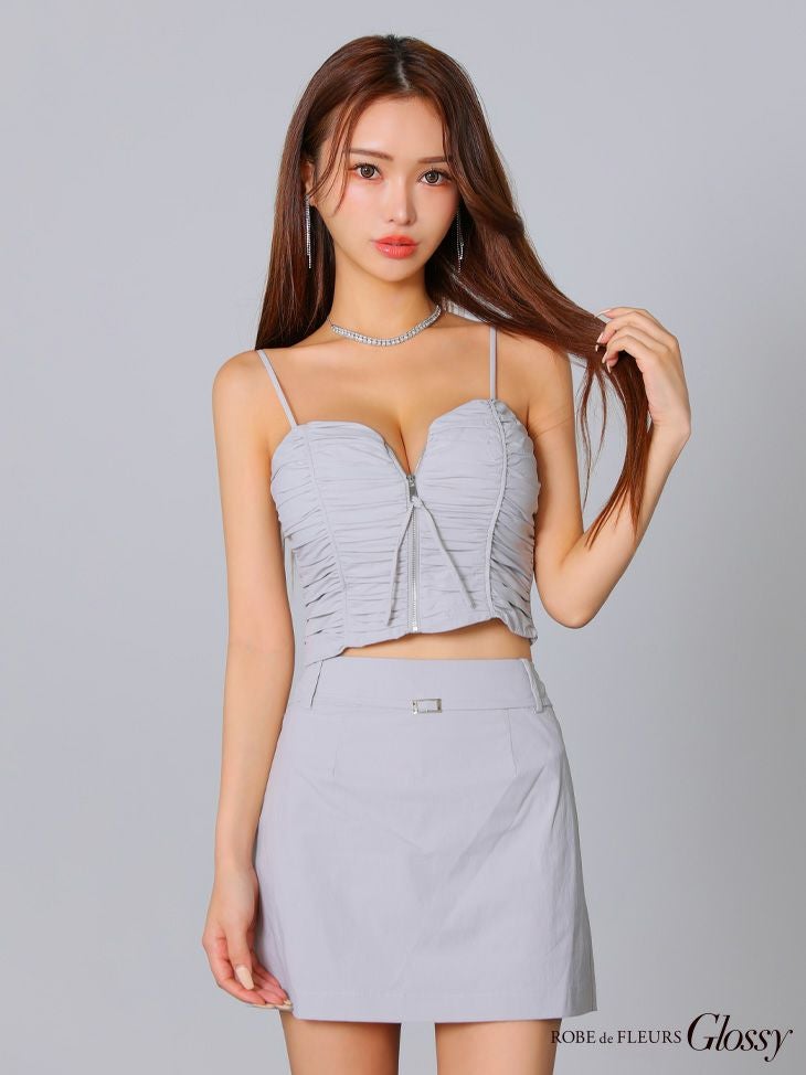 バストを強調するsexyドレス☆ [ROBEdeFLEURSGlossy/ローブドフルールグロッシー] 高級シャーリングキャミソールセットアップジップウエストベルトタイトミニドレス