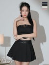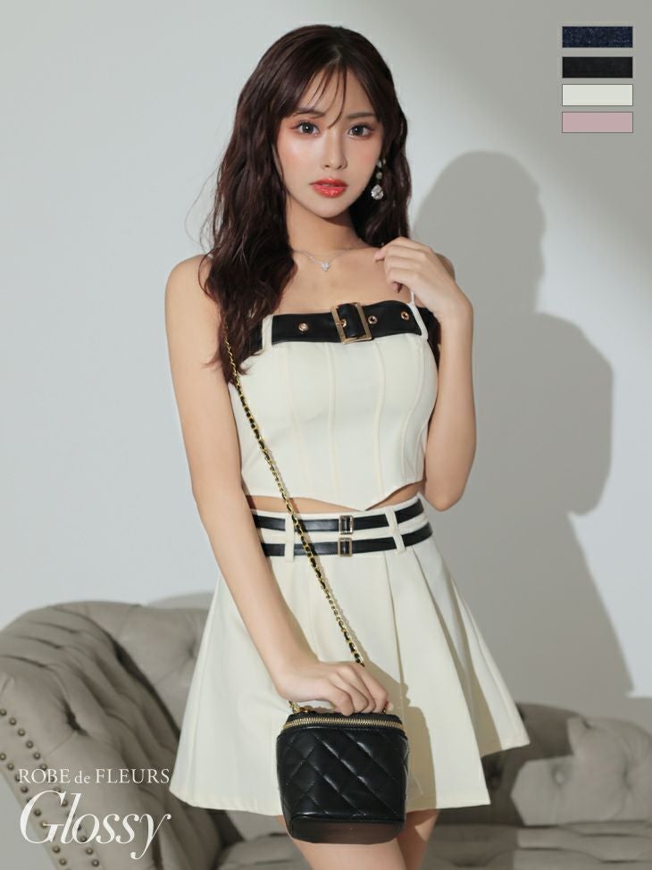プリーツスカートがCUTE★ [ROBEdeFLEURSGlossy/ローブドフルールグロッシー] 高級オフショルダーバックルダブルベルト2wayデニムセットアップフレアスカートフレアミニドレス