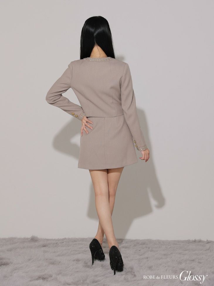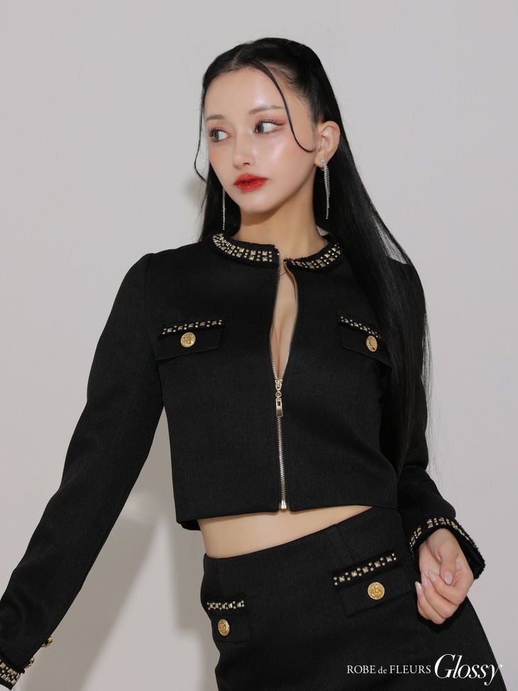 大人可愛いデザイン☆ [ROBEdeFLEURSGlossy/ローブドフルールグロッシー] 高級長袖 袖ありジャケット風ツイードセットアップジップゴールドデザインフレアミニドレス