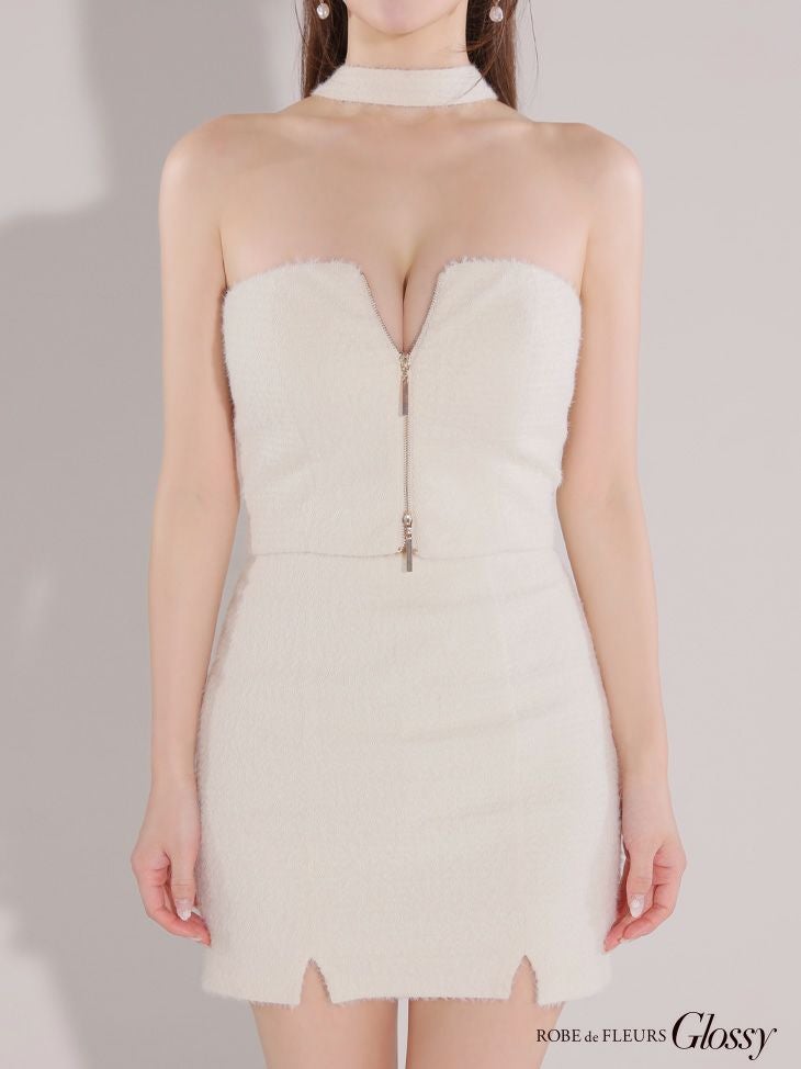 大胆な肌魅せが魅力的☆ [ROBEdeFLEURSGlossy/ローブドフルールグロッシー] 高級ニットフロントジップセットアップチョーカー風デザインシンプルタイトミニドレス
